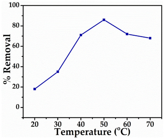The adsorption procedure was also analyzed to determine the effect of temperature on the adsorption rate [35]. The temperature vs. chromium removal rate using ZnO-NSs is shown in Figure 5. It is observed that with increase in temperature, the removal rate of chromium also increases. Increase in removal efficiency with increase in temperature indicates that the process is endothermic in nature. This effect is consequence of chemical reaction involved in adsorption process. As temperature is increased, mobility and diffusion of ions also increased. Thus, adsorption of Cr6+ ions increased. However, after reaching saturation point, this intercalation of ions stops and decrease in slope can be observed in the graph. The growth in Cr adsorption was observed up to 50°C, and after that rate of chromium adsorption decreases.