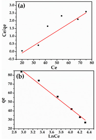 The Temkin isotherm model takes into account the effects of indirect adsorbate/sorbent interactions on the adsorption process [72]. Temkin isotherm model (Figure 6b) was found to be best fitted for the existing isotherm course.