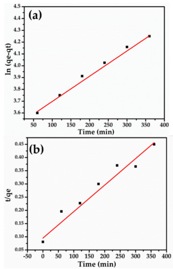 The pseudo-first-order model was fitted to explain the adsorption kinetics most effectively and the plots are drawn in Figure 7a,b.