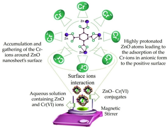 Figure 8 shows the plausible mechanism for the Cr6+ ions adsorption through ZnO nanosheets. The Cr6+ions adsorption mechanism may be described by an ion exchange process [76]. Initially, some of the Cr6+ ions are adsorbed on the surface of ZnO-NSs in the form of Cr thin film [35] which was due to the presence of a free adsorption sites or void, a prime requirement for the adsorption of Cr6+ ions. In these circumstances, surface unsaturation and struggle between sites for a limited amount of chromium ions were available, causing desorption and resorption of Cr6+ ions. However, the wide-ranging adsorption of Cr6+ ions upsurges with an increasing number of active sites [77]. Under visible light, the adsorption of positive Cr6+ ions on the negatively charged surface of ZnO has occurred with the formation of Cr2O3 plate-like precipitates [35]. In the aqueous medium, accumulation of H+ on the surface of ZnO cause surface polarization or protonation [78]. The Cr6+ions may bind to the surface of ZnO-NSs under the electrostatic interaction between the negative charged Cr6+ species and the protonated ZnO. It is appropriate to note that the surface reduction reaction will occur after the adsorption of Cr6+.