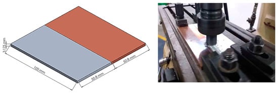 With the objective to set the parameters during the FSW, several experiments were carried out to get visually sound welds. In this study, plates of AA 6061-T6 and C11000 were joined by FSW using a conventional milling machine (JIH FONG, JIH FONG MACHINERY CO., Fengyuan, Taichung, Taiwan) in a lap configuration. The plates dimensions were 100 mm × 50.8 mm × 3 mm and a two combination set of each parameter were selected. This is shown in Figure 1, moreover, Table 1 presents the chemical composition of both materials according to manufactured data.