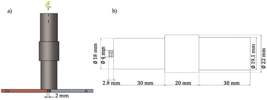 The copper plate was positioned in the advancing side and the aluminum alloy plate in the retreating side, with a 2 mm-displacement of the rotatory tool to the aluminum side. A D2 steel was used in the rotatory tool with a 4.5:1 shoulder/pin diameter relationship with a height pin of 2.8 mm. Before the welding, the rotatory tool was heat treated at 1100 °C followed by a reheating at 300 °C to obtain a 56 HRC hardness. Figure 2a shows the welding configuration and in Figure 2b the rotating tool design used in the present investigation.