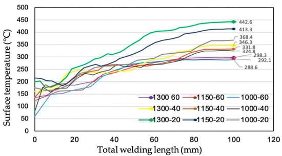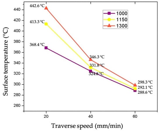 A heat input change was performed in FSW using different parameters, tool rotational speed and traverse speed, which ranged from 1000 to 1300 rpm and from 20 to 60 mm/min, respectively. The measurements of the changes in temperature, produced by the variation of the parameters, were carried out by thermographic analysis. Figure 5 shows the maximum surface temperature profiles obtained in each welding condition, between the tool and the base materials. It can be observed that the highest temperatures are obtained during the lowest traverse speed for any rotational speed. This is due to the increased contact time between the rotary tool and the surface of the workpieces. A slow rotational speed avoids that the weld zone reaches the appropriate temperature with enough plastic deformation, due to the lack of heat input. The weld zone cannot be properly plasticized and, consequently, the material flow is inadequate, which will generate defects, especially macrocracks and gap defects in the weld zone. With the increase in heat input, the movement of the tool through the joint line of the workpieces is facilitated. Some studies of different systems of Al-Cu by FSW have found a change in the heat input when varying the rotational speed and traverse speed. Some researchers like Xue, Barekatain, and Wiedenhoft [25,31,32] reported that tool rotational speed is the main responsible for the heat input. However, other authors such as Muthu and Saeid [27,33] consider that the traverse speed is important in the heat distribution over the joint. In the present work, both parameters affect the heat input, higher temperatures associated with higher rotational speed; however, the greatest changes in temperature are observed at the change of traverse speed at the same rotational speeds.
