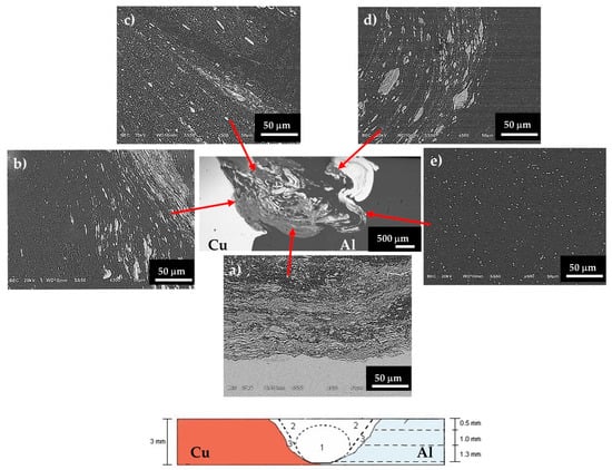 SEM micrographs of the cross section of the sample 1000_40. (a) nugget zone (DXZ), (b) heat affected zone (HAZ) Cu-side, (c) thermomechanically affected zone (TMAZ) Cu- side, (d) TMAZ Al-side, (e) HAZ Al-side.