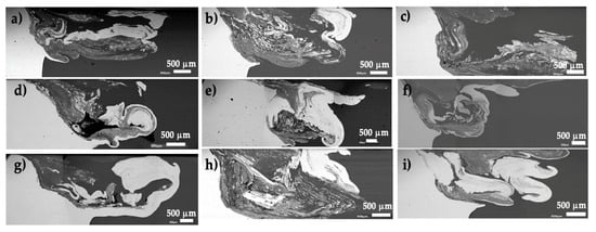 Figure 8 shows the microstructures for the different welding conditions, all having in common an Al matrix, alternating layers of aluminum and copper dispersed throughout the nugget. Alike, the flow pattern is different for every welding condition, by increasing the temperature during the welding process influences the material flow and, consequently, the welding quality. It is important to mention that there is no repetitive in the mixture of the two materials within the weld nugget, due to rotating the tool, the pin is dragging material around it and depositing it both in front of and behind it, which causes that different vortices appear for different welding conditions. It is important to mention, that there is no repeating pattern in the two materials mixture within the weld zone. That means, when the rotatory tool starts its movement, the pin is dragging material around it and deposits it both in front of and behind it, which causes different vortices, as shown in the different welded areas in Figure 8.