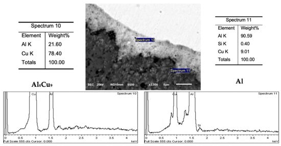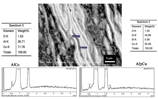 The IMCs appeared in different zones of the cross section of all samples, and with a SEM and EDS analysis, it was possible to determine the morphology of each intermetallic. The formation of IMCs was found, such as Al2Cu, AlCu, Al2Cu3, and Al4Cu9. The IMC that was present in the highest quantity, in all the welding conditions, was Al2Cu, that requires the lowest activation energy for its precipitation, while the IMC with the lowest quantity was Al4Cu9., that requires the highest activation energy for its precipitation [18,36]. In most of the investigations carried out by different authors find the IMCs Al2Cu and AlCu [16,17,18,19,20].