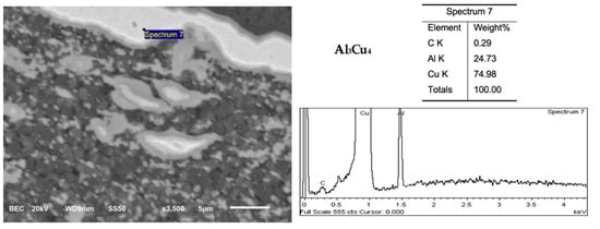 In Figure 11, Al4Cu9 particles are observed in the sample 1000_40, which appear more frequently in the areas close to both base materials. Moreover, Figure 12 shows Al3Cu4 particles in the sample 1000_20 and only in the regions close to Cu, since Al3Cu4 is not one of the first IMCs to form and requires a higher activation energy, it is common to find it in welds with a medium-high temperature (325–440 °C) during FSW.