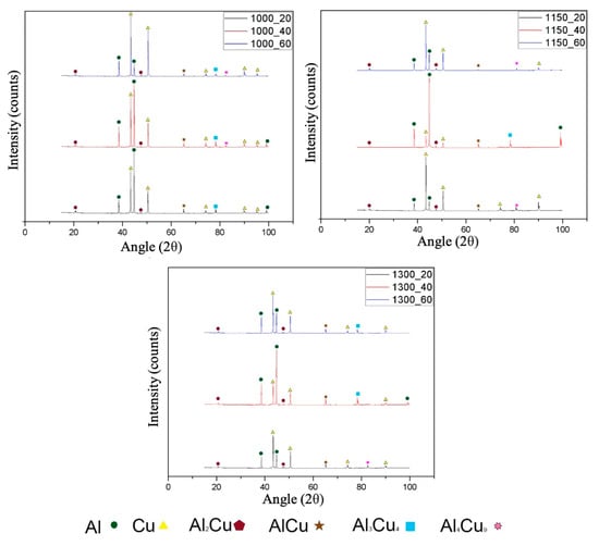 The morphology of these IMCs was identified using SEM and EDS analysis, and the phase composition was determined by XRD. Figure 13 shows the diffraction patterns obtained for the samples with 1000, 1150 and 1300 rpm, at different traverse speeds, respectively. The peaks corresponding to the IMCs were weak in all the joints, due to the low quantities of the IMCs formed. It is observed that the most common IMCs in the union of Al and Cu are Al2Cu and AlCu since they are present in all welding parameters. This is because they present the minimum activation energy. In the samples obtained at 60 mm/min, less intensity is observed in the intermetallic peaks, because these samples reached lower temperatures (288–298 °C) during the process, compared to the other traverse speeds. These temperatures are not high enough to favor the formation of IMCs. This confirms the EDS results and the intermetallic thickness.