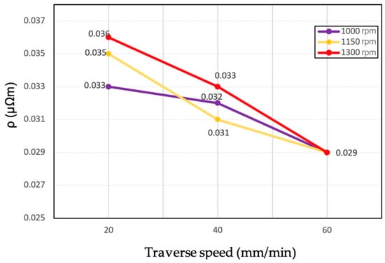 The electrical resistance to Al6061-Cu C11000 joint in all welding conditions was measured (144 measurements for each welding conditions) with a low resistance digital ohmmeter and the resistivity was calculated according to Equation (1). They were found in the electrical resistance measurements for the different welding conditions. The average electrical resistivity values are presented in Figure 14. It is observed that the electrical resistivities of the welds ranged between 0.029 and 0.036 μΩ. These changes in resistivity were due to differences in heat input, material flow, microstructure, and defects present in each weld.