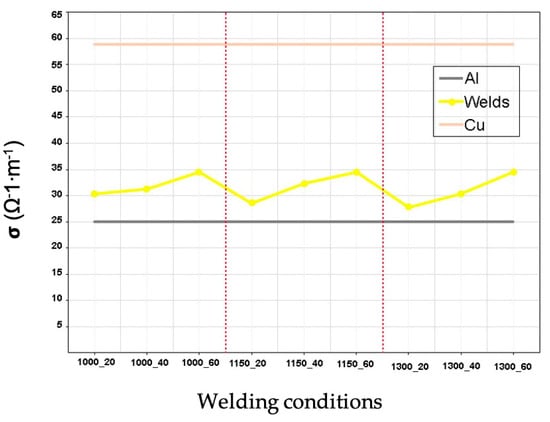 - The electrical conductivity of the joints increased compared to the conductivity of aluminum, being closer to the aluminum value than to that of the copper. However, the selection of the welding parameters tested in this investigation indicates that their application in electrical components will be feasible.