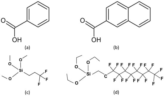 Molecular structures of the self-assembled monolayer (SAM) precursors (a) benzoic acid (BA), (b) 2-naphthoic acid (NA), (c) (3,3,3-trifluoropropyl)trimethoxysilane (F-3SAM), and (d) (heptadecafluoro-1,1,2,2-tetrahydrodecyl)triethoxysilane (F-10SAM).