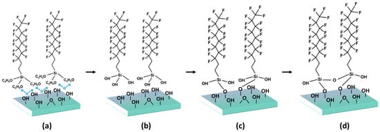 Water plays an important role in the SAM formation mechanism. A thin layer of water is present on the surface of the ITO substrate, which is physically adsorbed by the SAM. The alkyl group of the physically adsorbed SAM has fluidity, which helps align the SAM by the van der Waals force between the alkyl groups before condensation occurs [18,19,20]. The aliphatic SAM is hydrolyzed by water, and it obtains a hydroxyl group, which reacts with the hydroxyl groups present on the surface of the ITO substrate to form an Si–O alkyl group bond; the hydroxyl groups that do not react with the surface lose water through a condensation reaction, resulting in a polymerization reaction and an Si–O–Si bond. Thus, a well-aligned SAM is formed by strong bonding between the SAM and the substrate surface; the mechanism is shown in Figure 2. In the case of aromatic SAM, chemical bonding with the surface of ITO was achieved through dehydration condensation reaction between carboxyl group and hydroxyl groups.
