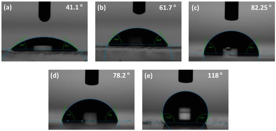 Contact angles were measured to confirm whether the different SAMs were successfully adsorbed onto the ITO substrate and to observe the change in surface properties. The results are shown in Figure 3 and Figure 4, which show the measurement results of the contact angles of the ITO substrates modified by the different SAMs. The measurement results were 41.1°, 61.7°, 82.25°, 78.2°, and 118° for bare ITO, BA, NA, F-3SAM, and F-10SAM, respectively. This result could be due to the energy level becoming lower as the number of π electrons increases in the π-conjugated system of the aromatic ring structure, and thus, as the length of conjugation increases [21,22]. In contrast, for the aliphatic SAM, the formation of a denser SAM on the ITO surface may have resulted from the strong van der Waals interaction between the alkyl chains as the alkyl chain length increased. The results show that for each SAM the precursors had successfully adsorbed onto the ITO surface and also that the modified surface has low wettability, displaying hydrophobicity. In theory, holes are injected into the HTM through the ITO surface. ITO is a hydrophilic inorganic surface. In contrast, HTM is a hydrophobic organic material. This difference induces a heterojunction between the two interfaces, adversely affecting the growth and stability of the organic film [23]. This increases the hydrophobicity of the surface through the formation of the SAM on the ITO surface, thus eliminating the inorganic/organic imbalance at the ITO/HTM interface.