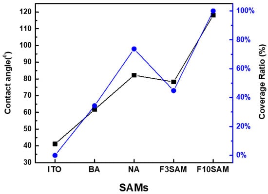 When C1 has a value between 0 and 1, θ1 is the contact angle of bare ITO, and θ2 is the contact angle of the ITO surface modified by F-10SAM in the above equation, the quantitative ratio of SAMs based on Cassie’s law is shown in Figure 4. The ratios are 0% for bare ITO, 34.3% for BA, 73.7% for NA, 44.8% for F-3SAM, and 100% for F-10SAM. This equation confirms that for different SAM-modified ITO surfaces, higher hydrophobicity was exhibited when the aliphatic chain length was increased than when the number of aromatic rings was increased.