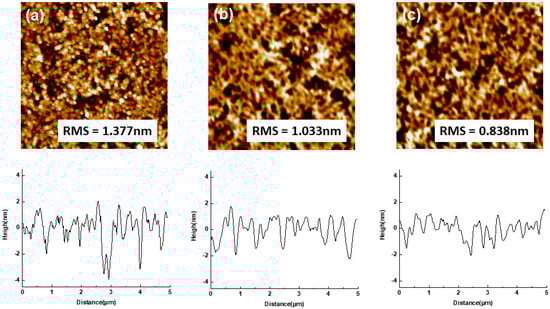 Figure 5 and Table 1 show the atomic force microscope images and the average roughness values from measurement results on bare ITO, the aromatic-NA-modified ITO surface, and the aliphatic-F-10SAM-modified ITO surface. The average roughness effective values measured by an atomic force microscope were as follows: bare ITO, 1.377 nm; NA, 1.033 nm; and F-10SAM, 0.838 nm. These AFM results show that the average roughness of the SAM-modified ITO is reduced, both of which show a similar surface topology indicating one or more single monolayers of SAM molecules have been formed on the ITO surface [24,25]. The low average roughness and hydrophobicity of the ITO surface could resolve the energy difference between ITO and the HTM.