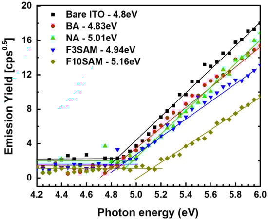 ITO has a low work function value of approximately 4.8 eV. The low work function value of ITO induces a large energy barrier due to the difference with the large work function of HTM materials, resulting in a low hole injection efficiency. Figure 6 shows the graph of the work function measurement results when the SAMs are modified on the ITO surface by ultraviolet photoelectron spectroscopy. The measurement results were 4.83, 5.01, 4.94, and 5.16 eV for BA, NA, F-3SAM, and F-10SAM, respectively, which show that the work function value of the ITO surface increases through SAM film modification. Furthermore, these results have confirmed that the work function shifts to higher values for the aliphatic-structure SAM-modified surface than for the aromatic-ring-structure SAM-modified surface.