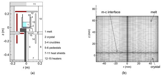 (a) Schematic configuration of the directional solidification furnace: melt (1), crystal (2), quartz crucible (3), carbon crucible (4), pedestals (5, 6), heat shields (7–11), heaters (12–15), and (b) a local view of the computational grid in the melt–crystal domain.