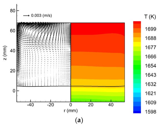 The DS furnace used in this study consisted of a crystal, silicon melt, crucibles, pedestals, heat shields, and heaters, as shown in Figure 1a. The crystal’s height was 80 mm and its diameter was 108 mm. Figure 1b shows the computational grid of the melt–crystal domain. The melt–crystal interface is calculated using a dynamic interface tracking method. The melt–crystal interface is moving upward as a function of time. The grid size of boundary areas such as the melt–crystal interface, melt surface and melt–crucible wall interface is 0.007–0.1 mm. We developed our own simulation code as follows. A transient global model was developed for the DS process to study the global heat transfer in the entire furnace, flow field in the melt, and shape of the melt–crystal interface as a function of time. The global heat transfer in the entire furnace included the convective heat transfer of the silicon melt, conductive heat transfer in all of the solid components, and radiative heat transfer in all of the diffusive surfaces of the furnace. A dynamic interface tracking method was also included to obtain the shape of the melt–crystal interface. The following major assumptions were made for the simulations: (i) The geometry of the furnace configuration is axisymmetric; (ii) the melt flow is incompressible and laminar; (iii) the radiative heat transfer can be modeled as a diffuse-gray surface; and (iv) the effect of the gas flow in the furnace is negligible and can be ignored. The governing equations for melt flow under these conditions are as follows: