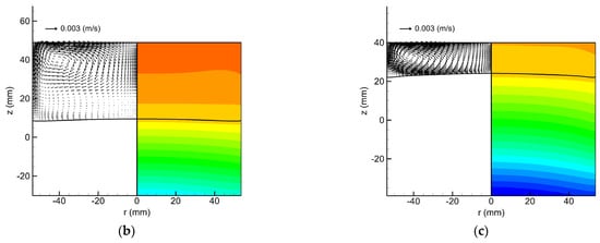 Temperature distribution and flow field in the melt and crystal with a solidified fraction of (a) 20%, (b) 50% and (c) 80%.
