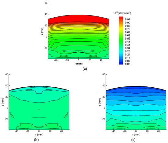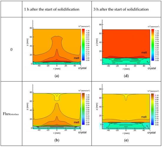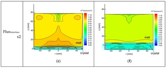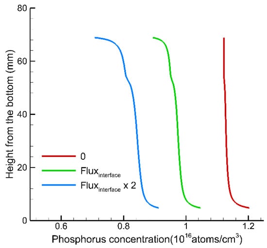 Figure 8a–c show the distribution of the phosphorus concentration in the melt with different evaporation fluxes at the melt surface one hour after the start of solidification. The difference of phosphorus concentration in the melt was large, as shown in Figure 6 and Figure 8a–c. The effect of the phosphorus evaporation flux at the melt surface on the phosphorus concentration at the melt–crystal interface was small because the melt volume was large, velocity of the melt convection was small, and solidification time was short. Figure 9 shows the distribution of the phosphorus concentration in the center of the melt along the vertical direction with different evaporation fluxes at the melt surface at one hour after the start of solidification. We could identify that there was a large difference in the phosphorus concentration at the melt surface because the phosphorous evaporation flux was very effective. However, the phosphorus concentration at the melt–crystal interface was close even though the evaporation flux at the melt surface was different because the phosphorous evaporation flux at the melt surface had little effect on the phosphorus concentration at the melt–crystal interface. Figure 8d–f show the phosphorus concentration distribution in the melt with different evaporation fluxes at the melt surface three hours after the start of solidification. In these three hours, the melt volume decreased and solidification time increased. Thus, the phosphorus concentration in the melt could have been more homogeneous, and the difference between the maximum and minimum phosphorus concentrations in the melt was small because the melt mixing was enhanced and the effect of the evaporation flux of phosphorus at the melt surface on the phosphorus concentration at the melt–crystal interface subsequent to three hours after the start of solidification was larger than that subsequent to one hour after the start of solidification. Figure 10 shows the distribution of the phosphorus concentration in the center of the melt along the vertical direction with different evaporation fluxes at the melt surface at three hours after the start of solidification. We can say that there was a considerable difference in the phosphorous concentration not only at the melt surface but also at the melt–crystal interface, and the phosphorous concentration in the melt subsequent to three hours after the start of solidification was more homogeneous than that subsequent to one hour after the start of solidification. Thus, the effect of phosphorus evaporation flux at the melt surface on the phosphorus concentration at the melt–crystal interface at the beginning of the solidification process is minor.