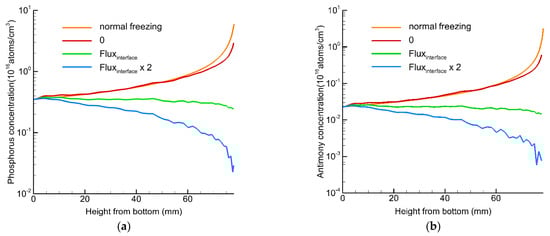 Distribution of the (a) phosphorus and (b) antimony concentration in the center of the crystal along the vertical direction with different evaporation fluxes at the melt surface. The evaporation flux at the melt surface was (i) 0, (ii) the same as the incorporation flux at the melt–crystal interface, and (iii) twice as large as that of case (ii).