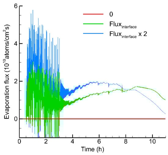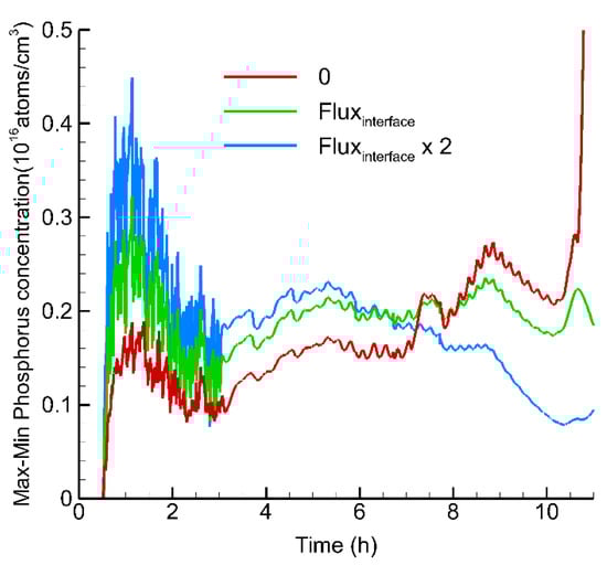 Figure 6 shows the difference between the maximum and minimum phosphorus concentrations in the melt as a function of time; Figure 7 displays the history of the phosphorus evaporation flux at the melt surface as a function of time. At the beginning of the solidification time, the difference between the maximum and minimum phosphorus concentrations in the melt in case (i) was small because the phosphorus evaporation flux at the melt surface was zero. However, at the end of the solidification time, the difference between the maximum and minimum phosphorus concentrations in the melt in case (i) rapidly increased because of the effect of the small segregation coefficient of phosphorus. Therefore, the phosphorus concentration in the melt in case (i) substantially changes from the beginning to the end of the solidification time. Moreover, at the beginning of the solidification time, the difference between the maximum and minimum phosphorus concentrations in the melt in case (iii) was larger than that in the other two cases because of the large evaporation flux at the melt surface. However, at the end of the solidification time, the difference between the maximum and minimum phosphorus concentrations in the melt in case (iii) was smaller than that in the other two cases. The phosphorus evaporation flux at the melt surface was related to the growth rate and phosphorus concentration at the melt–crystal interface, as shown in Equation (6). In this case, the phosphorus concentration in the melt had a large effect on the behavior of the phosphorus evaporation flux at the melt surface in case (iii) because the growth rates in cases (ii) and (iii) were the same. The phosphorus concentration in the melt in case (iii) was lower at the end of the solidification time because the phosphorus had already evaporated considerably at the beginning. Therefore, the phosphorus concentration in the melt in case (iii) also changed substantially from the beginning to the end of the solidification time. In contrast, the difference between the maximum and minimum phosphorus concentrations in the melt in case (ii) remained almost constant throughout the solidification time. This caused the enhancement of the phosphorus evaporation at the beginning of the solidification time and almost kept the same phosphorus evaporation flux until the end of the solidification time, as shown in Figure 7. Therefore, we needed to maintain nearly the same phosphorus concentration in the melt during the whole solidification process to obtain a crystal with a homogeneous phosphorus concentration distribution along the vertical direction.