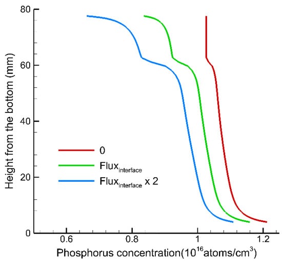 where is the diffusion coefficient in the silicon melt and is the phosphorus concentration at the melt surface. We applied the phosphorus incorporation flux at the melt–crystal interface, Fluxinterface, to the phosphorus evaporation flux at the melt surface, Fluxmelt surface. The phosphorus incorporation flux at the melt–crystal interface was represented as follows: