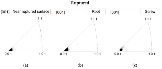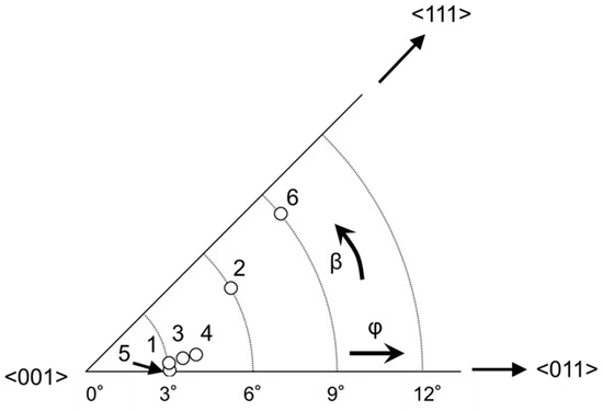 The nominal composition of HESA in this study is 48.0Ni-16.9Co7.5Cr-8.9Fe-0.9Mo-0.5W-5.8Ti-10.3Al-1.2Nb (at. %) [8]. The composition of the alloy after casting was confirmed to be almost the same as the nominal composition by inductivity coupled plasma–optical emission spectrometry (ICP-OES) [11]. The crystal orientations of the single-crystal bars were then measured by the X-ray back Laue method using the X-ray generator (SA-HF3, Rigaku Co., Tokyo, Japan) with a tungsten target. The crystal orientations of the bars are plotted in Figure 1.
