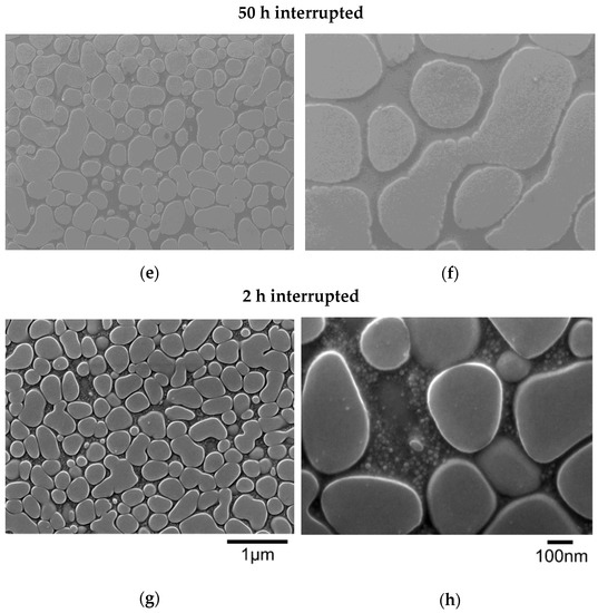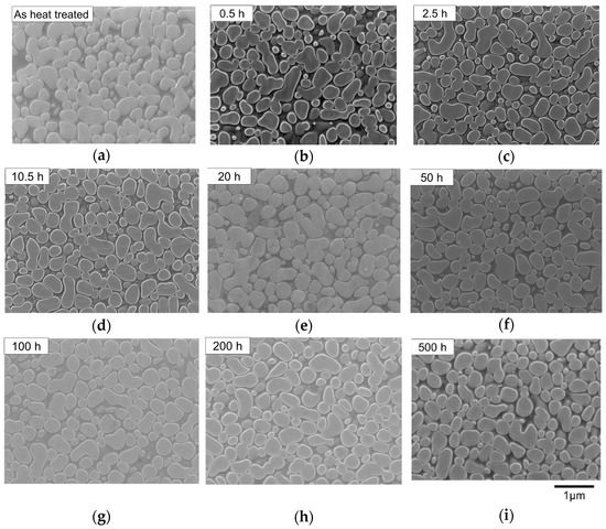 Figure 2 shows the microstructural evolution caused by the long-term aging at 760 °C, and Figure 3 shows their magnified images, respectively. In Figure 2, the morphology of the primary γ′ precipitates shows no significant change, whereas at higher magnitude, coarsening of the secondary γ′ precipitates was observed from 0.5 to 50 h of aging time in Figure 3b–f, then the coarsened secondary γ′ precipitates disappeared by 100 h of aging as shown in Figure 3g indicative of Ostwald ripening. After the disappearance of the coarsened secondary γ′ precipitates, much finer secondary γ′ precipitates with uniform distribution were discerned in Figure 3g–h indicating that these secondary γ′ precipitates form during cooling from the aging treatment at 760 °C.