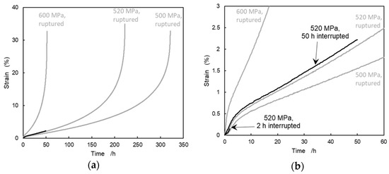 Therefore, we focused on the creep condition under 520 MPa of the applied stress at 760 °C in order to further investigate the deformation mechanism. We also conducted creep interrupted tests at 2 h, showing the maximum strain rate in the primary creep, and at 50 h, showing the minimum strain rate in the secondary creep, respectively. Creep curves for these interrupted tests are almost identical to that of the ruptured creep curve obtained by the same applied stress as shown in Figure 4b.