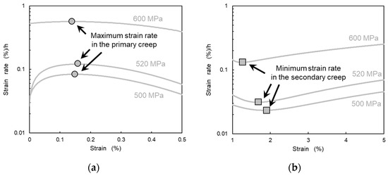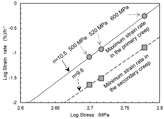 where (/h) stands for the strain rate during creep, (/h(MPa)n) stands for the constant value, and (MPa) stands for the applied stress level, n represents stress exponents obtained from several creep data to estimate the deformation mechanism, respectively. To estimate strain rates from creep curves at different stress levels, fitting equations of creep curves were used [18]. The maximum strain rates were used for evaluating the primary creep, whereas the minimum strain rates were used for evaluating the secondary creep, to obtain n values, respectively. Figure 5 depicts the strain and strain rate relationship in the primary creep region and secondary creep region, respectively, showing the maximum strain rate in the primary creep and the minimum strain rate in the secondary creep region. Figure 6 summarizes the stress and strain rate relationship. The plots for both the strain rates follow the straight lines, respectively. This indicates that dominant deformation mechanism in the primary creep is similar within the stress range from 500 to 600 MPa. Furthermore, the dominant deformation mechanism in the secondary creep is also similar in the stress range. This result suggests that to understand the creep deformation mechanism under the stress condition ranging from 500 to 600 MPa, only the creep condition within the stress range is sufficient. Examining one condition of creep at 760 °C between 500 and 600 MPa of applied stress could represent the deformation mechanisms of the creep at 760 °C between 500 and 600 MPa applied stress levels at both the primary and the secondary creep regions, respectively.