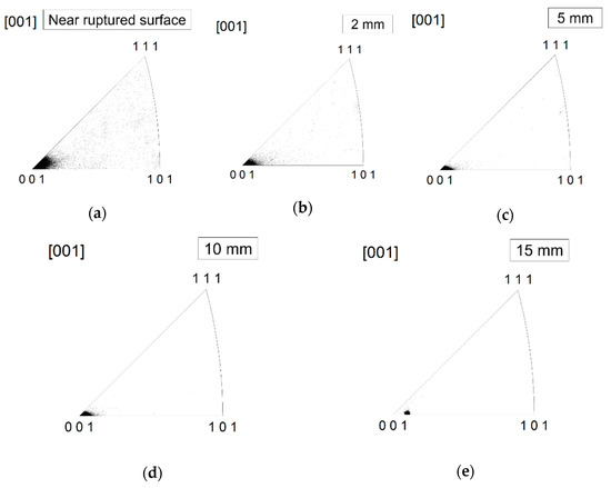 Standard stereographic triangles analyzed using electron backscatter diffraction (EBSD) in ruptured specimen parallel to applied stress axis as a function of distance from the ruptured surface. The creep test was conducted under the condition of 760 °C and 520 MPa. The analyzed area was rectangular with approximately 1000 μm in the applied stress axis and approximately 2000 μm in the direction perpendicular to applied stress axis. EBSD analysis was conducted at the step size of approximately 5 μm. (a) Near the ruptured surface, (b) 2, (c) 5, (d) 10, (e) 15 mm away from the ruptured surface.