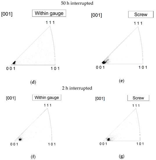 Standard stereographic triangles analyzed using EBSD in specimens perpendicular to the applied stress axis at a condition of 760 °C and 520 MPa. The analyzed area within the gauge was a square with approximately 4000 μm edge length, and EBSD analysis was conducted at the step size of approximately 10 μm. The analyzed area in the screw part was a square with approximately 8000 μm edge length, and EBSD analysis was conducted at the step size of approximately 20 μm. (a–c) Ruptured specimen, (d,e) 50-h interrupted, (f,g) 2-h interrupted.