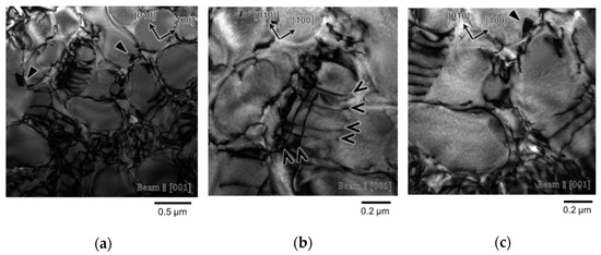 In the case of the 50-h interrupted specimen, shearing of the γ′ precipitates by paired straight dislocations which might be a pair of superpartial dislocations with APB was observed, as shown in Figure 13b,c. Stacking faults in the γ′ precipitates were hardly observed. There were two types of paired straight dislocations with a line directed along <110> indicated by black arrows in Figure 13b and directed along <100> indicated by white arrows in Figure 13c, respectively. In a similar manner to previous research [16], the <110>-directed paired dislocation appears to be 60° superpartial paired dislocation. The same previous research also shows that the <100>-directed paired dislocation from the view of [001] appears to be screw superpartial paired dislocation [19].
