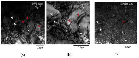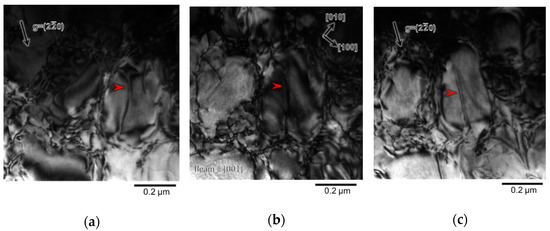 Bright-field image in the root of the ruptured specimen using TEM in the various tilting conditions within the gauge of the ruptured specimen. The red arrow indicates bowed out paired dislocation, which is focused on: (a) 20.3° from [001] along Kikuchi band with on the side of with g = , (b) from the view of , (c) 32.4° from [001] along Kikuchi band with on the side of with g =