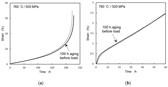 Creep curves at 760 °C and 520 MPa comparing the results between specimens with and without additional 100-h aging at 760 °C. (a) Whole region of creep curves, (b) early stage of creep curves.
