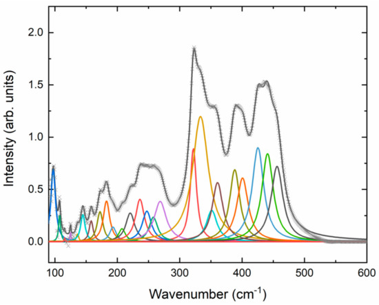 Regarding the other bending vibrations, five ν2 modes were detected in our experiments. The frequencies of three of them agree well with previous studies [,,], with ours observed at 3–5 cm−1 higher frequencies due to the higher pressure (0.9 GPa) in the sample. The brilliance and resolution of the experimental set-up enabled the identification of two modes that were previously undetected. Additionally, the mode reported at 366 cm−1 in Ref. [] was not observed in our measurements, and it was not reported in the rest of the works in the literature [,,,]. We note that the frequency of this mode is approximately double the frequency of the 183 cm−1 mode detected in the present work and elsewhere in the literature [,,,] and that it is therefore likely to be an overtone.