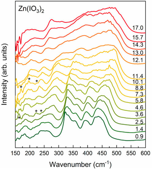We will now comment on the data acquired at higher pressures. For the sake of accuracy, we will concentrate on wavenumbers higher than 150 cm−1 because the signals at lower energy became noisy with increasing pressure. Figure 3 displays IR spectra measured at different pressures (indicated in the figure). It is clear in Figure 3 that there are qualitative changes in the spectra at 3.6 GPa, in particular for wavelengths smaller than 300 cm−1. In particular, three modes (marked by asterisks) increase in intensity. The transition pressure is close to the loss hydrostaticity of the pressure medium (3 GPa) []. The influence of non-hydrostaticity in phase transitions induced by pressure in Zn(IO3)2 is beyond the scope of this study. Additional changes occur in the IR spectra at 8.8 GPa. In particular, several modes broaden, and three low-frequency modes (also marked with asterisks) become enhanced. Finally, there is a considerable broadening of phonon bands at 13 GPa and higher pressures. Similar changes have been assigned to phase transitions in the case of Fe(IO3)3 [,]. Thus, phase transitions could be the cause of the changes observed in the IR spectra. Further evidence supporting the existence of phase transitions in Zn(IO3)2 is obtained via the analysis of the pressure dependence of the mode frequencies described immediately below.