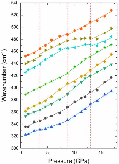 From the analysis of the HP experiments, we determined the pressure dependence of eight internal bending modes and ten lattice modes. The results are shown in Figure 4 and Figure 5. In Figure 4, it can be clearly seen that there are changes, at 3.6 and 8.8 GPa, in the pressure dependence of several modes; in particular, the bending modes with frequencies of 360 and 440 cm−1 among others. There are also clear changes in the modes with frequency 353 and 425 cm−1 at 8.8 GPa. On top of this, at 13 GPa, there are noticeable changes in the eight bending modes shown in Figure 4. In particular, there are discontinuities in at least two of the frequencies, indicating the occurrence of more important structural changes in the third phase transition than in the other two transitions.