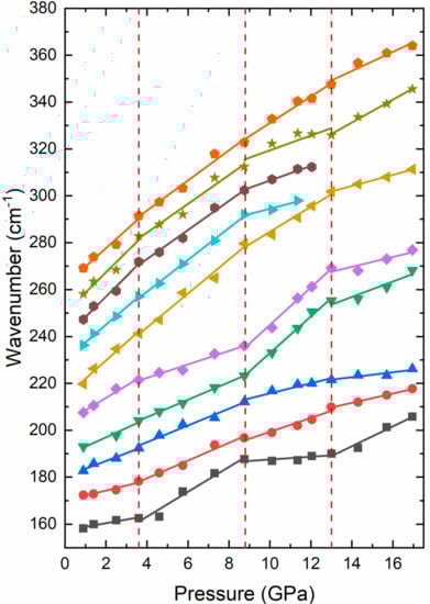 Before concluding, we would like to add a comment on the transition at 13 GPa. The changes observed around 13 GPa are more apparent than those observed around 3.6 and 8.8 GPa. This suggests that the changes around 13 GPa can be linked to the occurrence of a first-order structural transition. The fact that the changes are accompanied by a marked broadening of phonon bands suggests a disorder of the crystal structure [], which could be related to the presence of non-hydrostatic stresses at 13 GPa and higher pressures [].