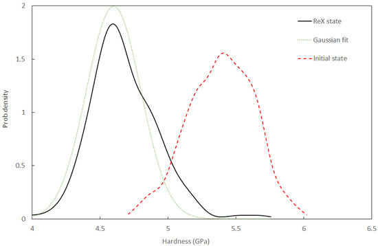 Comparison of the hardness probability density function for the initial state and the fully recrystallized (ReX) state. The ReX state was fitted using a Gaussian function.