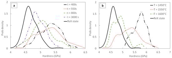 Effects of annealing time and temperature on hardness distribution are shown in Figure 3. The curves are shifted significantly to the left for increasing annealing time and/or temperature. The frequency distribution tends to have a higher standard deviation and thus wider distribution plots compared to the fully recrystallized plots. However, the set of data is clearly not rich enough regarding microstructure heterogeneity to permit a quantitative analysis of the upper distribution tail. Therefore, results will be mostly analyzed hereafter from the mean values of the measured distributions. In that sense, the mean hardness is used to compute the softening fraction using Equation (2). Let us recall here that the softening fraction differs from the fraction recrystallized, since the recovery-induced softening is accounted for.