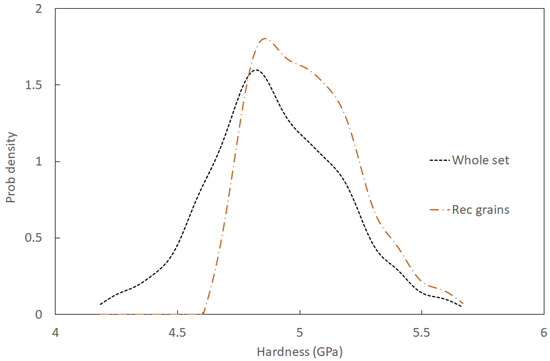 Hardness probability density function of recovered grains compared to the full probability density function (T = 1550 °C, t = 3000 s). Softening fraction is about 65% here, whereas fraction recrystallized X computed through nanoindentation testing is about 30%.