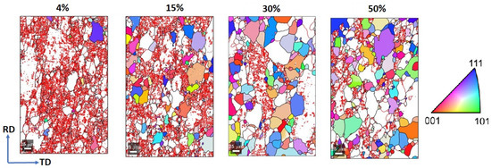 EBSD maps representing the evolution of softening fraction at T = 1550 °C. The grain boundaries are in black, the sub-grain boundaries are in red and the recrystallized grains are colored according to (IPF Z—normal direction).