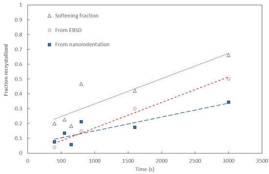 The time-evolution of the fraction recrystallized (T = 1550 °C) computed using the procedure above and from EBSD measurements is compared to the softening fraction (Figure 7). The mean hardness has the same meaning as a Vickers test for which the hardness is an average value over several grains due to the indentation size [6]. More precisely, it is a mixed value of the hardness of recovered grains and recrystallized grains, and what is computed is much more a restoration-induced softening fraction than a fraction recrystallized. Methodologies based only on Vickers macro-hardness tests usually overestimate the fraction recrystallized by neglecting the effect of recovery. Therefore, it is expected that the softening fraction will be higher than the true fraction recrystallized. The softening fraction is here up to two times larger than the fraction recrystallized estimated through the statistical nanoindentation analysis. This latter permits one to separate the contributions of recovery and recrystallization mechanisms to macroscopic softening. It is not surprising that EBSD measurements lead to in-between values, since statistical nanoindentation and EBSD methods are both based on measurements at the grain-scale. Nonetheless, the fraction recrystallized estimated from EBSD depends strongly on the chosen criterion to detect a recrystallized grain. Clearly a universal definition of the measurement of recrystallization fraction through EBSD measurement is a matter of debate [28,30] and is far beyond the scope of this paper.