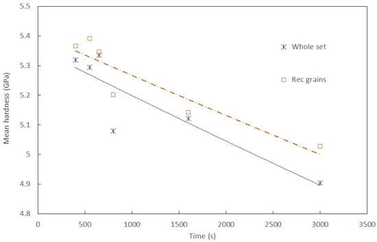 Once the fraction recrystallized is estimated, the hardness probability density function restricted to the set of recovered grains (Figure 5) can be analyzed. The time-evolution of the mean value of hardness (T = 1550 °C) is plotted in Figure 8. As expected, it decreases with time and is above the mean hardness computed on the whole set. However, the trends—i.e., the slopes—are very similar for the two sets of grains. The contribution of the recrystallization mechanism to the hardness decrease is quite low—about 0.1 GPa—whereas the contribution of the recovery mechanism is about 0.4 GPa. For the temperature range investigated in this paper—i.e., 1450–1600 °C—recovery seems to prevail in terms of softening. To get similar conclusions without using statistical nanoindentation analysis would require one to correlate EBSD measurements with Vickers measurements. However, a limitation of the present analysis deserves to be discussed here. The hardness probability density function of the fully recrystallized state has been measured on one sample, the only one that was available during the period of time of this investigation. If the nanoindentation-derived fraction recrystallized were to be underestimated, the recovery-induced hardness drop would be overestimated. At least, it may be concluded that recovery and recrystallization mechanisms overlap and that recovery has to be considered to accurately measure recrystallization kinetics of tungsten at elevated temperature.