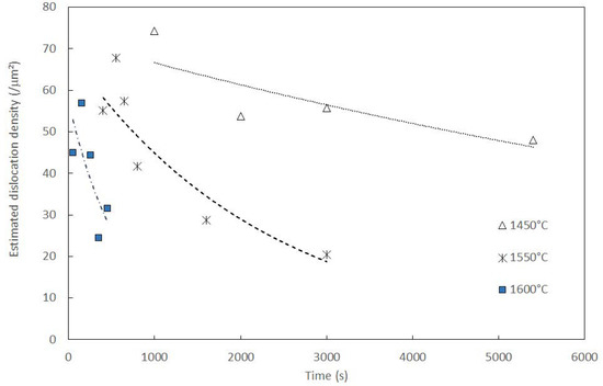 whereby is the hardness of the fully recrystallized materials. The decrease of dislocation density—computed through Equation (10)—versus time is plotted in Figure 9. For each temperature, the variation is consistent with the exponential shape proposed in Equation (7). It is worth noting that such an evolution is also consistent with a recovery mechanism controlled by dislocation climb that would lead to [3].