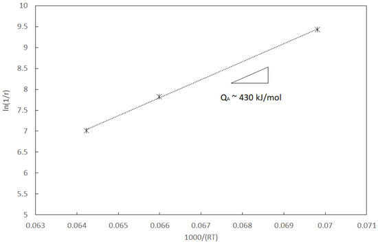 The recovery coefficient, as defined in Equation (7), is plotted in Figure 10 for temperature range 1450–1600 °C. The recovery parameter increases with temperature, as expected. From this plot and the Arrhenius equation —where Q is the activation energy and R is the universal gas constant—it is possible to extract the related activation energy. It is observed to be about 430 kJ/mol, which is roughly consistent with the order of magnitude of bulk self-diffusion in tungsten ≈500–650 kJ/mol [34]. Considering a mechanism controlled by dislocation climb [3], the activation energy would be ≈600 kJ/mol, which is again in agreement with bulk self diffusion. Moreover, some other recovery mechanisms deserve to be explored through this kind of measurement, such as subgrain coarsening. In that case, hardness might be related to the sub-grain size and boundary misorientation [17,21]. There is clearly a need for future works in that area. Let us note that the recrystallization activation energy might have been evaluated through the time at 50% recrystallization. Unfortunately, such an investigation was not possible in the present study, since most of the specimens were less than half-recrystallized. It is worth noting that the present paper is a first attempt in the estimation of parameters related to recovery/recrystallization mechanisms through statistical nanoindentation. Despite the observed scatter, the results are roughly consistent with literature.