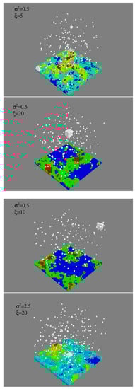 We performed kinetic Monte Carlo simulations of the lattice model on a system with size in lattice units a. In all the simulations the temperature is fixed at and the bulk density fixed by the reservoir is in lattice units. The bulk density was chosen sufficiently low that the nucleation was not instantaneous—making impossible to meaningfully study the effect of substrates—but sufficiently high that the critical cluster was not large compared to system dimensions. (Typical critical clusters consisted of between 60 and 100 molecules, so with diameters between 5 and 6 lattice sites.) We generated exponentially correlated random rough surfaces with given variance and correlation length , typical examples of which are shown in Figure 1.