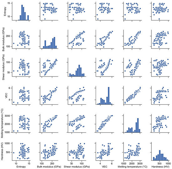 A subset of the scatterplot of the features before the condition indices step is shown in Figure 1. There is clear association between that bulk modulus, valence electron concentration, entropy, and melting temperature, suggesting that these features are highly correlated. The calculated Pearson’s correlation of coefficient [31] between the RHEA features of 128 samples’ data is shown in Table 1.